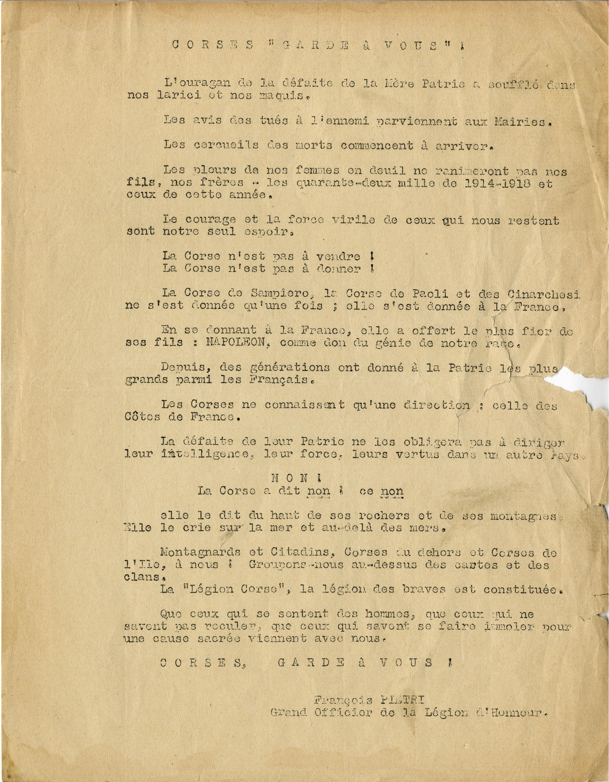 Le premier acte de résistance corse est dû au commandant François Pietri (1887-1961). C’est un tract qu’il rédige le 11 juillet 1940, Corses, garde-à-vous ! qui est diffusé à plusieurs centaines d’exemplaires aussi bien dans l’île qu’en France continentale et dans les colonies. Il vise à mobiliser les Corses contre la menace d’une annexion italienne après l’armistice. A une époque où les modalités de résistance demeurent à inventer, Pietri cherche donc à constituer une sorte de « mouvement dormant » – la Légion corse, en référence à une des premières unités françaises créées en 1769 et composée presque exclusivement de volontaires d’origine insulaire – qu’il réactiverait en cas d’invasion de l’île par Mussolini. Si le contenu du tract ne s’attaque pas au régime de Vichy qui vient à peine de naître, son ton mêle culture corse et italophobie aux patriotismes insulaire et français. Cet officier recrute exclusivement parmi la communauté d’origine corse. La Légion corse apparaît également comme l’expression patriotique d’une culture professionnelle : celle d’un militaire de carrière. Recherché par les Italiens sous l’Occupation, Pietri est contraint à la clandestinité dans les montagnes de son village natal de San Gavino di Carbini. Refusant toute alliance avec le Front national et marginalisé par les communistes, le maquis du commandant Pietri est néanmoins actif contre l’occupant et les délateurs. En septembre 1943, il participera les armes à la main à la Libération de l’île, dans l’Alta-Rocca.