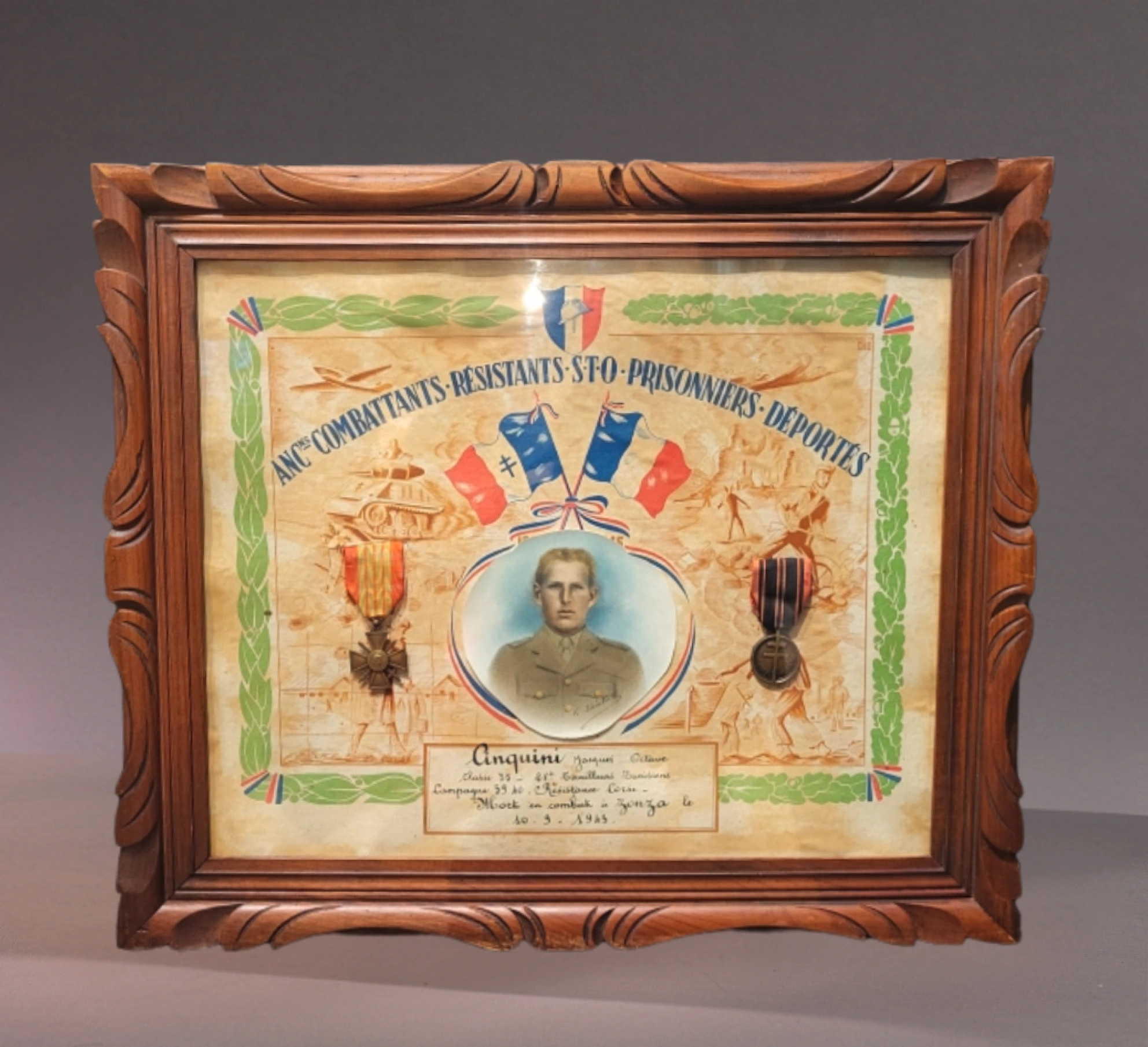 A l’issue de la guerre, des milliers de famille éprouvent le besoin de commémorer le sacrifice d’un de leur membre ayant participé à la Résistance. Comme à la fin du premier conflit mondial, on voit ainsi apparaitre des diplômes et autres documents mis sous verre et encadrés qui sont accrochés dans les intérieurs des habitations afin de perpétuer la mémoire du défunt tout en exposant aux visiteurs et aux proches, de manière ostentatoire, la perte consentie au nom de la Résistance. Ce cadre évoque la mort de Jacques Cinquini, résistant tué les armes à la main par les Allemands alors qu’il défendait l’entrée du village de Zonza, le 10 septembre 1943. Il était âgé de 28 ans.