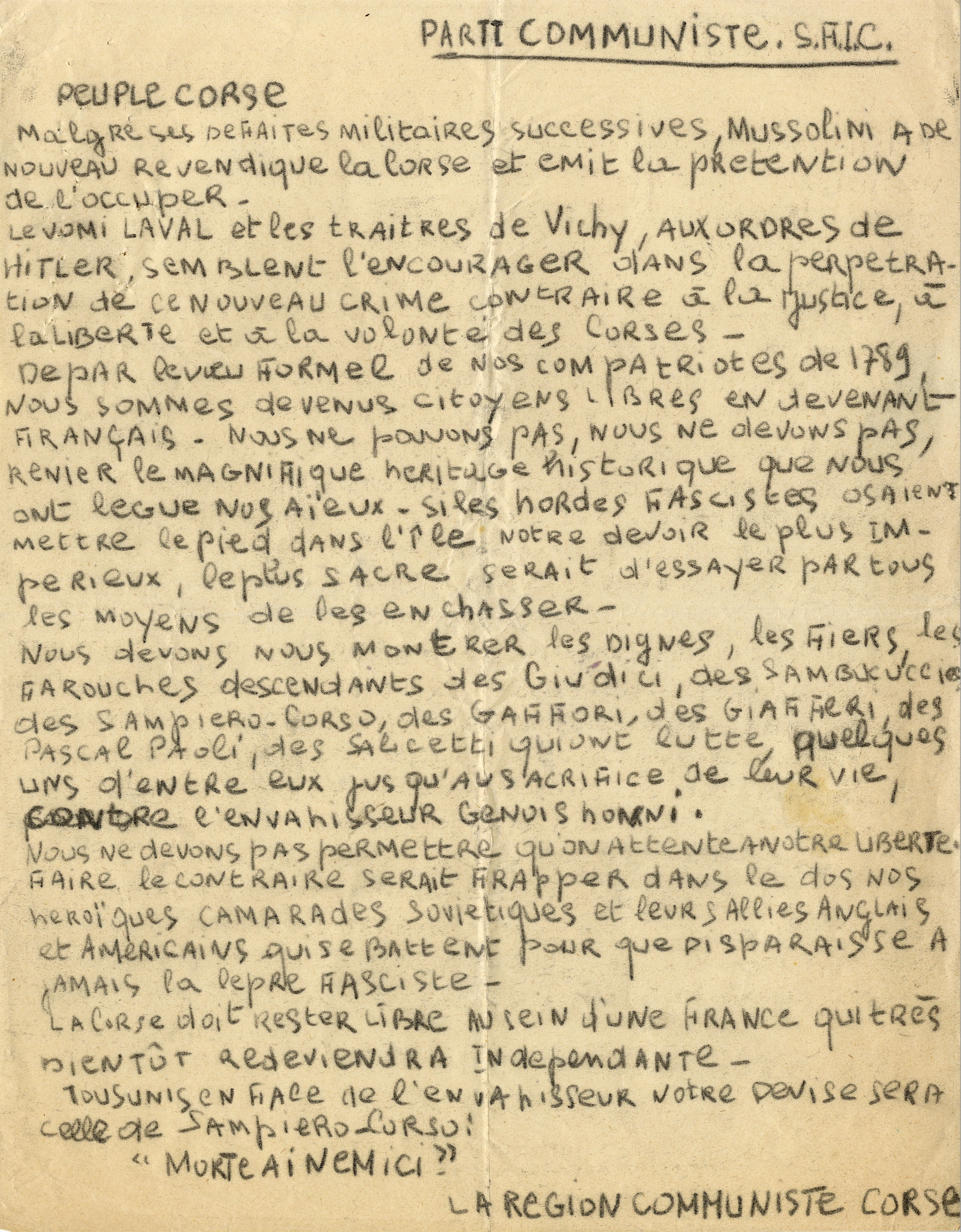 Mais surtout, l’enracinement de la Résistance dans la société corse et le succès du Front national en 1943 doivent beaucoup à l’élaboration d’une propagande clandestine portant un discours identitaire fondé sur la culture insulaire. Les références à l’histoire de la Corse supplantent les allusions à l’histoire nationale et aux valeurs républicaines. Les grandes figures du panthéon local sont mises en avant : Sampiero Corso et Pascal Paoli et autres héros du XVIIIe siècle. Liés au combat « historique » des Corses contre les Génois à l’époque médiévale et moderne – que l’occupation fasciste réactive dans les esprits –, ces personnages sont utilisés dans leur dimension régionale. La « petite patrie » prend le pas sur la « grande » parce que la menace d’annexion, puis l’occupation italienne placent le destin de la Corse au centre des préoccupations de la population et motivent les engagements résistants.