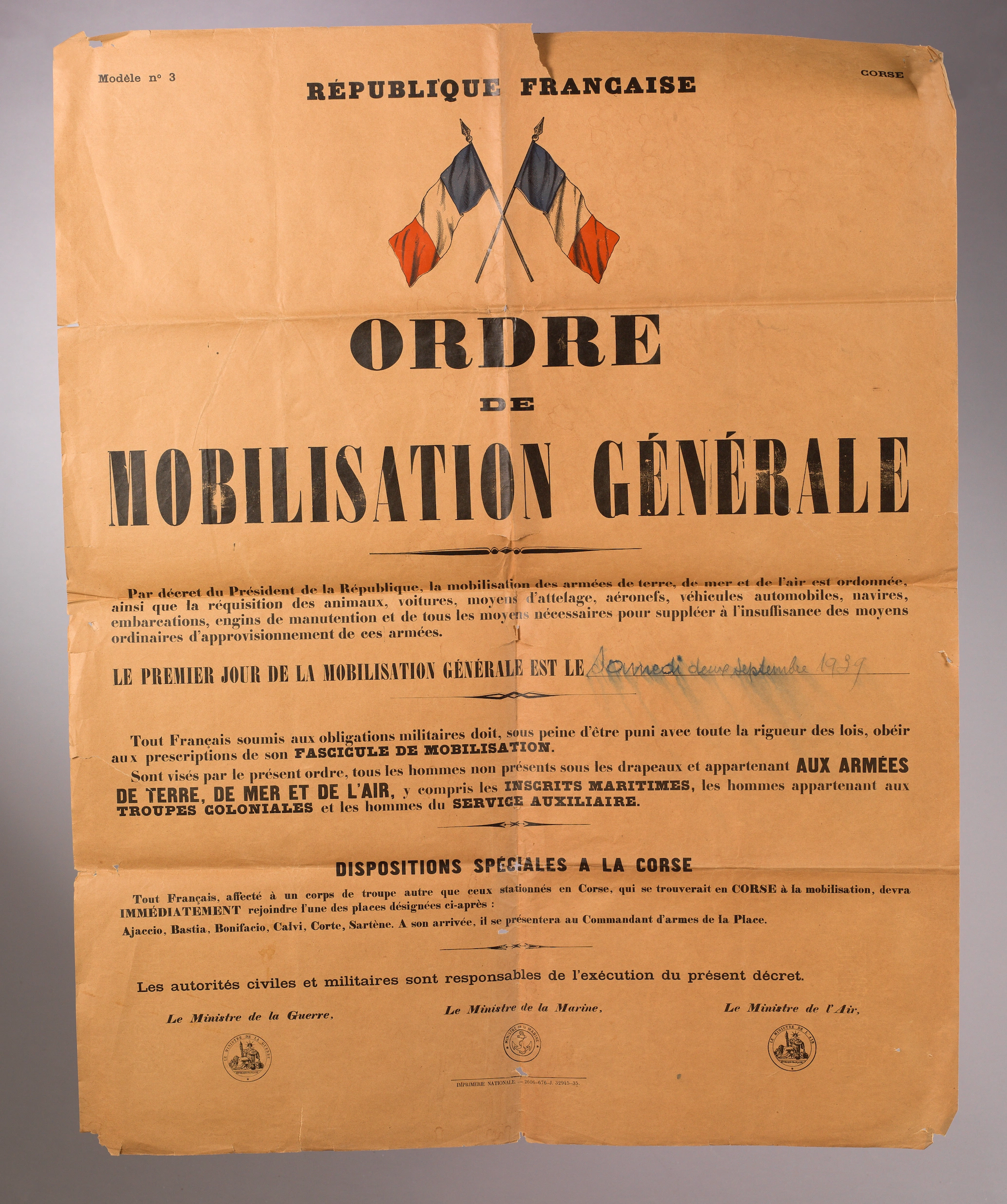 Le 22 août 1939, une décision ministérielle ordonne au général Mollard, gouverneur militaire de la Corse, de décréter l’état de siège dans l’île. Le 3 septembre suivant, à 17 heures, face au refus d’Hitler de retirer ses troupes du territoire polonais, la France déclare la guerre à l’Allemagne. La mobilisation est immédiatement déclarée. Dans l’île, comme partout ailleurs, sont placardées les célèbres affiches annonçant la nouvelle à la population tandis que la radio diffuse des communiqués. La presse écrite n’en informe le public que le lendemain.